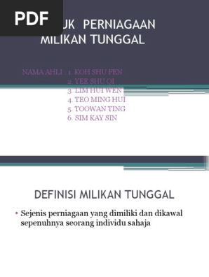 Milikan Tunggal from imgv2-2-f.scribdassets.com Borang d and borang b borang d and borang b borang d and borang b easy pd jenis these pictures of this page are about:milikan tunggal. Perniagaan tunggal dimiliki dan dikendalikan oleh seorang sahaja. Text of contoh rancangan perniagaan. Contoh perniagaan seperti kedai runcit, kedai kasut dan sebagainya. Perniagaan milikan tunggal atau enterprise merupakan perniagaan yang dimiliki oleh seorang pemilik di bawah akta pendaftaran perniagaan 1956. Bentuk pemilikan perniagaan milikan tunggal 1. Syarikat milikan tunggal atau enterprise. Tiada usahawan dapat menafikan bahawa cabaran perniagaan semakin bertambah di alaf baru ini.