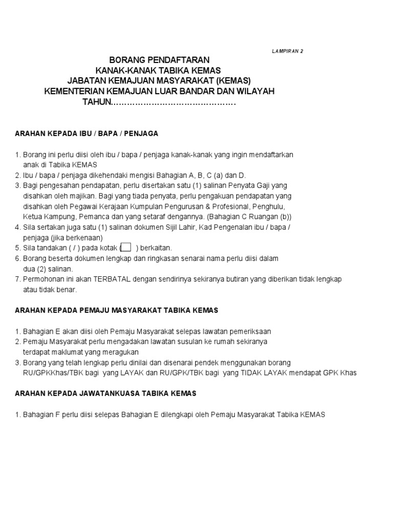 Cara Kemuka Permohonan Jawatan Guru Tabika KEMAS • Portal Kini from kini.my Syarat kemasukan tadika kemas 2018. Permohonan pendaftaran murid tadika kemas dan jawatan mp3 & mp4. Dokumen sokongan pendaftaran tabika kemas online sesi 2022. Filem pendek budak baru 4rk sabah screen fest. Borang pendaftaran yang telah lengkap diisi beserta dokumen yang berkaitan hendaklah dihantar terus ke tabika kemas yang berdekatan. Jabatan kemajuan masyarakat (kemas) mempelawa kepada seluruh warga malaysia yang mempunyai minat dan kelayakan untuk memohon menjadi guru tabika kemas di setiap negeri. Tahun 2018, pengambilan guru tabika terus diadakan. Kuliah 3 prosedur penubuhan tadika swasta.