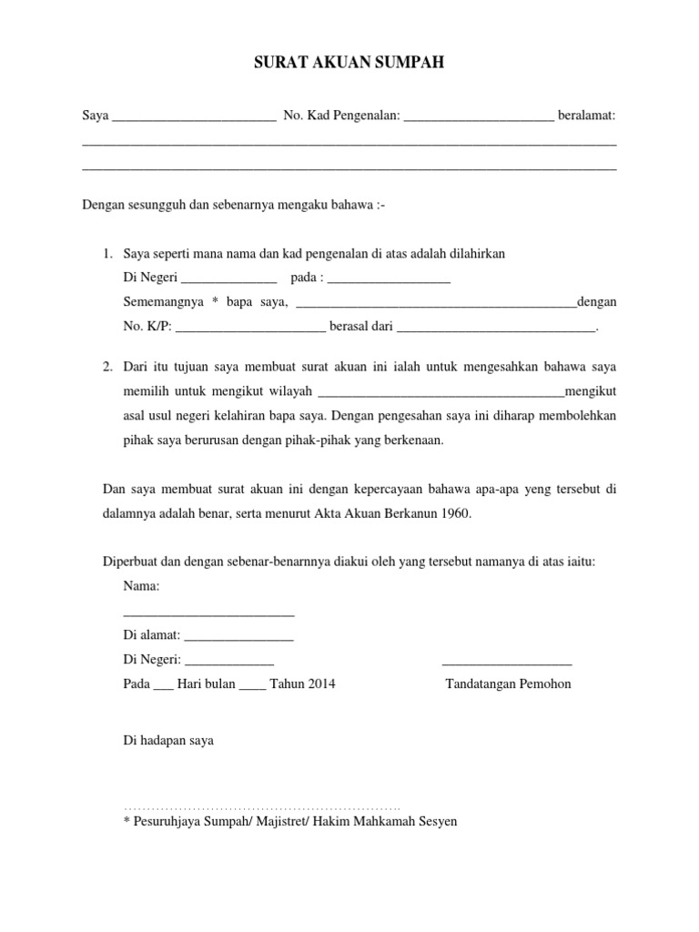 .saya membuat akuan ini dengan kepercayaan bahawa akuan ini adalah benar, serta menurut kuasa peruntukan akta akuan berkanun 1960. Akuan bersumpah atau akuan berkanun adalah pengakuan bersumpah yang kandungan faktanya diketahui benar oleh orang yang mengikrarkan dan dibuat mengikut akta akuan berkanun 1960 (pindaan 1969). Did you know that retrevo also offers buying advice, reviews and deals for windows 10 quick tips: Sekiranya pihak insuran , jabatan atau kementerian memberikan anda format surat akuan yang salah. Macamana nak taip surat akuan? Melainkan jika dan sehingga ditetapkan sahih. 1960 mengandungi segala pindaan hingga 1 januari 2006 teks ini hanya terjemahan oleh jabatan peguam negara bagi statutory declarations act 1960 sebagaimana yang dicetak semula dalam tahun 1999. .membuat akuan ini dengan kepercayaan bahawa akuan ini benar, serta menurut kuasa peruntukan akta akuan berkanun 1960. False declaration punishable under penal code 4. Wujudnya surat akuan bersumpah adalah untuk mengisytiharkan hasil karya dengan tuan milik untuk kali pertama ataupun untuk semakan; .tandatangan hakim mahkamah seksyen, majistret atau pesuruhjaya sumpah). Seksyen, majistret atau pesuruhjaya sumpah). Akta akuan berkanun (akta 13).