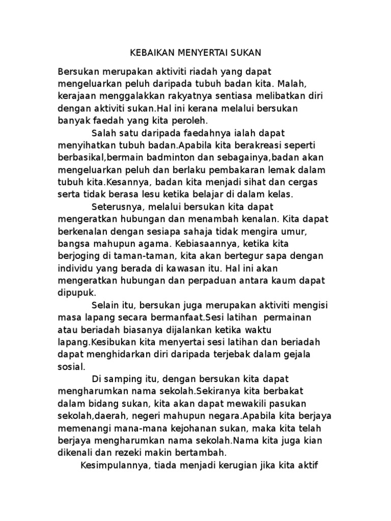 Karangan kepentingan program khidmat negara. Karena begitu semangat , olahraga tersebut dilakukannya setiap hari , dimulai dari olahraga ringan seperti jogging, hingga olahraga ekstrim seperti terjung lenting (bungee jumping). Dapat mengisi masa lapang dengan perkara yang berfaedah. Dasawarsa ini, negara kita telah dilanda oleh gelombang inflasi secara global. Setiap pelajar diwajibkan menyertai aktiviti sukan di sekolah.