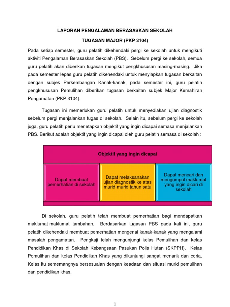 Laporan pengalaman berasaskan sekolah tugasan major (pkp 3104) pada setiap semester, guru pelatih dikehendaki pergi ke sekolah untuk mengikuti aktiviti pengalaman berasaskan sekolah (pbs).